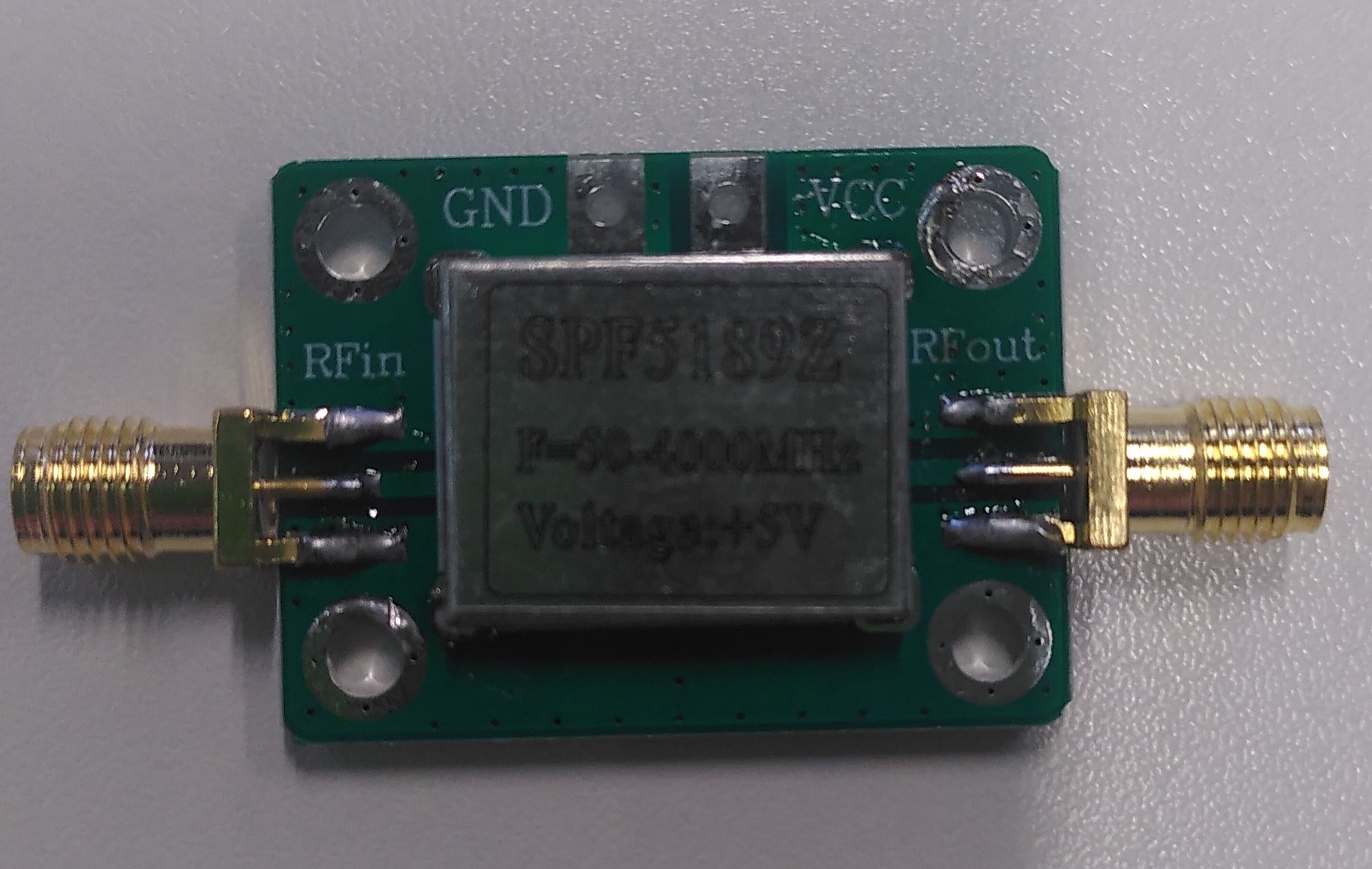 The input is usually connected to the Preamplifier Port of the Transcoupler and the output to the RX port of the LimeNQR spectrometer.